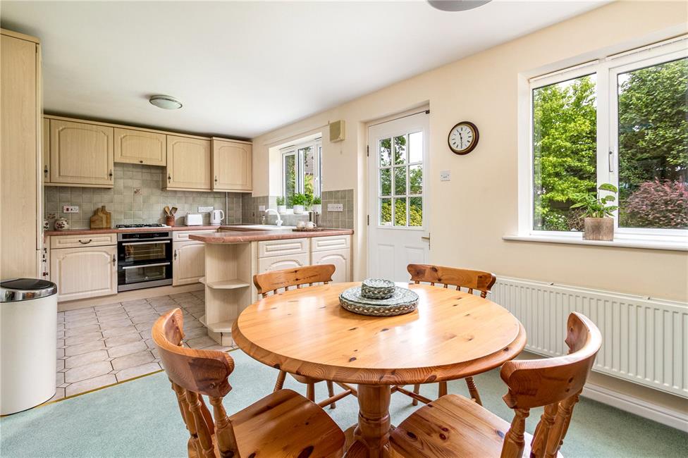 Two windows overlooking the glorious rear garden, a modern style kitchen appointed along three sides comprising of eye level units and base units with drawers and marble style round nosed worktops over, inset 1.5 bowl sink with mixer tap, ceramic wall tiling to work surface surrounds, fitted four burner gas hob with double oven below, integrated fridge, freezer, integral Bosch dishwasher, ceramic floor tiles in the kitchen area and carpeted to the dining area, wall mounted Worcester gas central heating boiler concealed behind a matching wall unit, TV point, double radiator, steel panel double glazed door giving access to the rear garden.