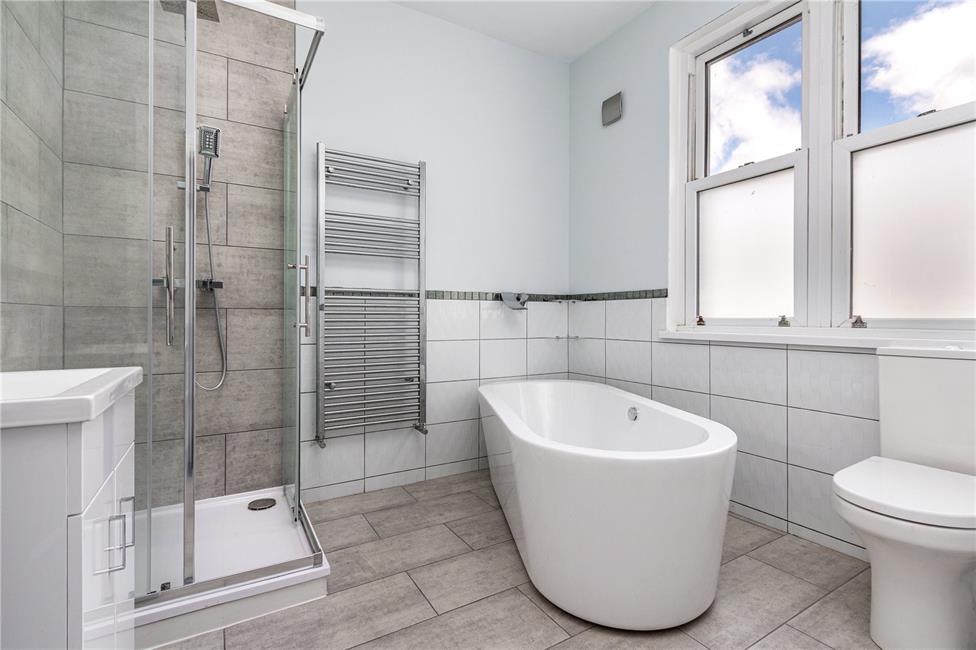 Comprising low level WC, free standing bath, large corner shower cubicle with shower head, shower screen panel, vanity wash hand basin with cupboards below, ceramic wall tiling to half height with border tiles, tiled flooring.