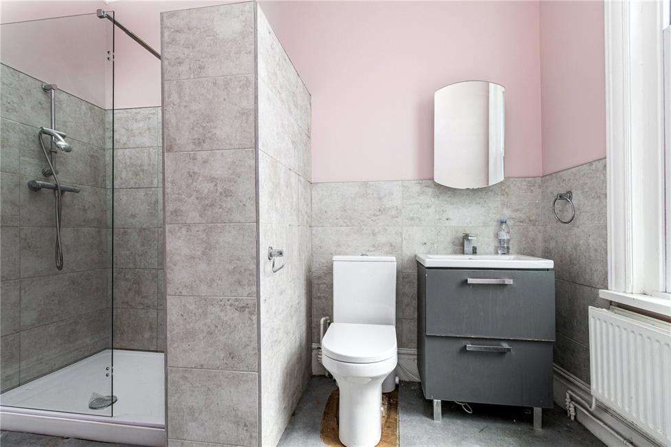 Comprising macerator wc, vanity wash hand basin with cupboards below, low level WC, double shower cubicle with screen, double panelled radiator.