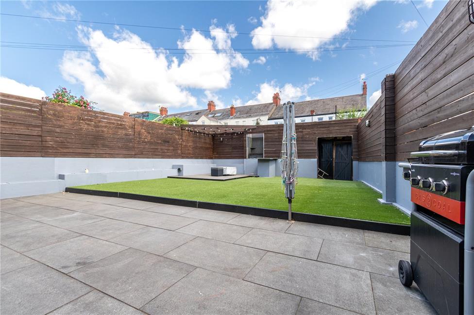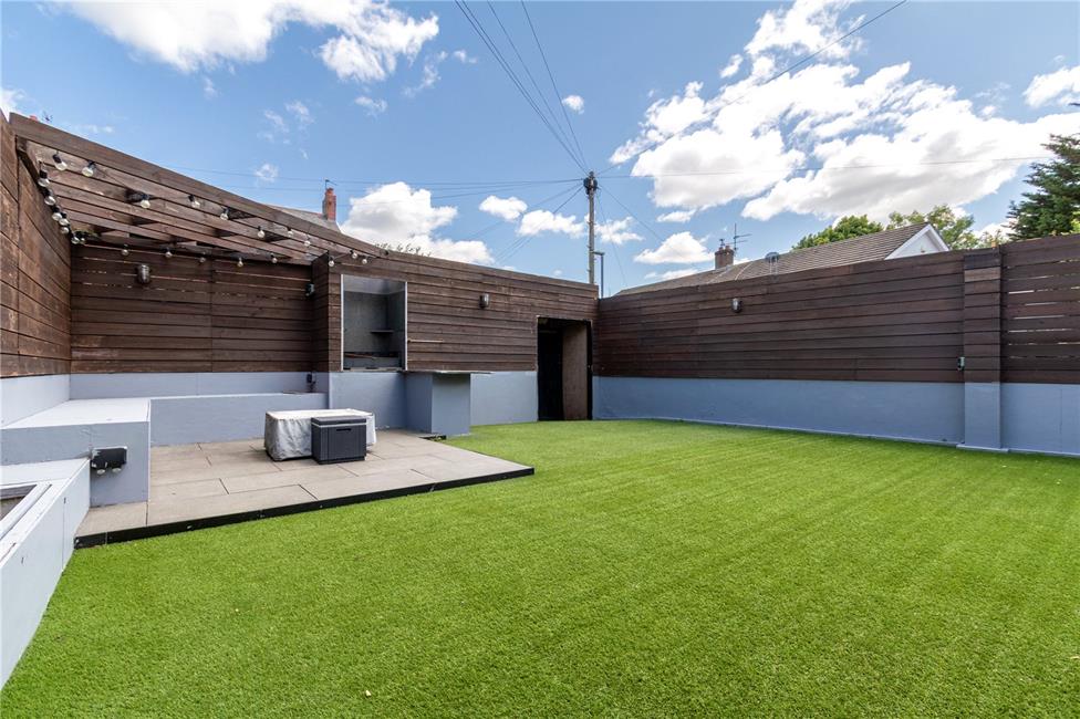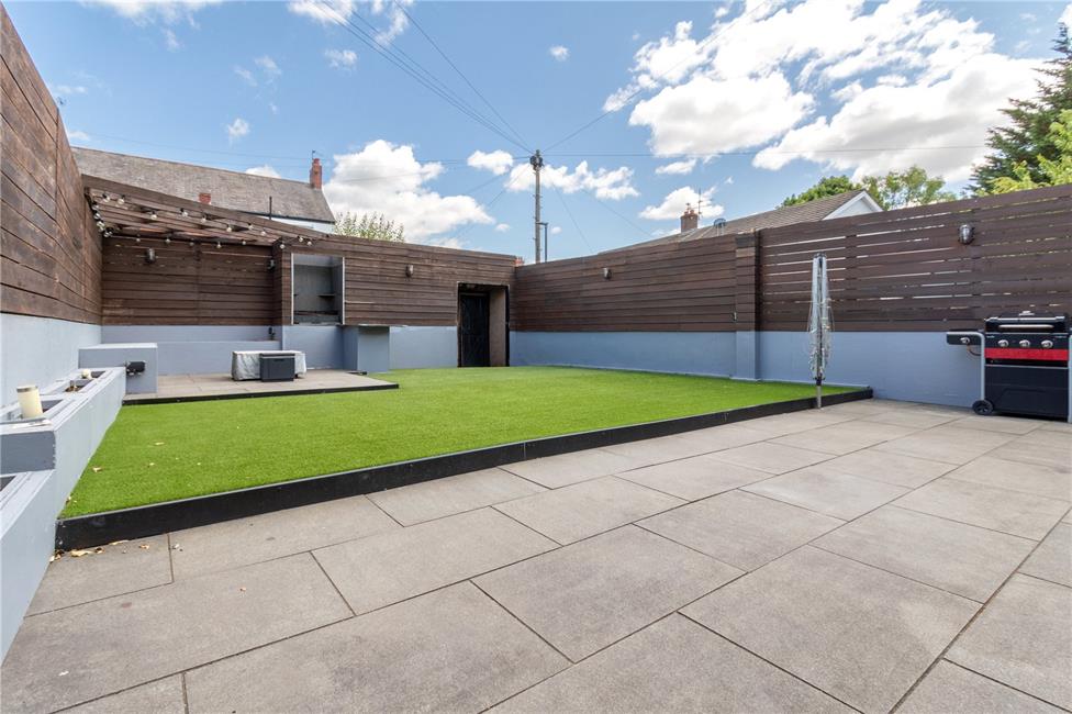 Wide stone patio area leading onto an area of artificial lawn with additional patio at the far end with seating. Door to rear lane. Outside lighting. Useful deep store contiguous to the main property.