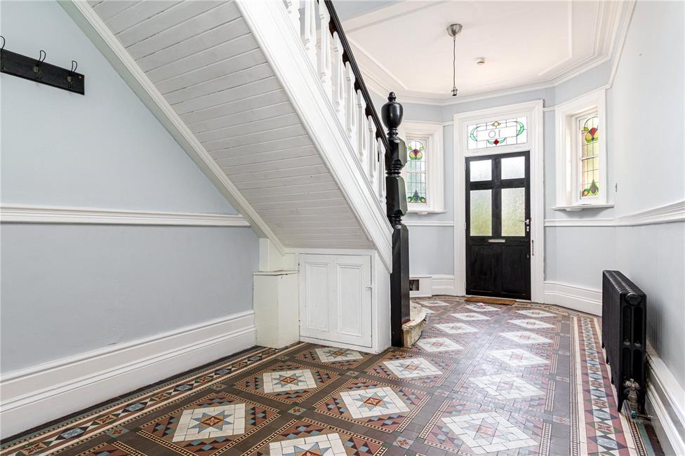 Panelled front with sealed double glazed inserts to upper part, leading onto an imposing and large central hallway with single flight staircase to first floor, feature newel posts and bannister, decorative tiled flooring, tall cornice ceiling, original light windows to front with secondary glazing. Tubular freestanding radiator.