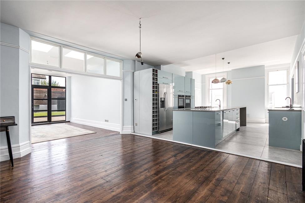 With central aluminium double glazed French doors matching side screen, overlooking the attractive rear garden, natural floor boarding, velux light monitors.