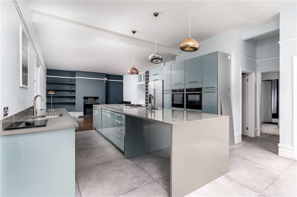 Excellent proportions with a range of base and eye level wall cupboards beneath quartz work top surfaces, large central island, inset stainless steel sink with mixer tap, inset five ring gas hob, integrated oven, integrated microwave with warming tray, retractable larder, Hotpoint fridge/freezer, additional one and a half bowl sink with mixer tap, integrated dishwasher with matching front, feature island breakfast bar area, two double glazed sash cord style windows to side, tiled flooring, large walk-in pantry with shelving, Fire place with hood, tubular free standing radiator, bespoke book shelving, opening to .