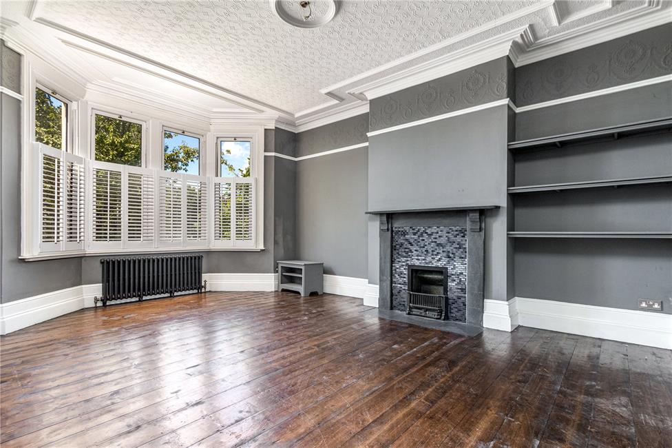 Approached from the kitchen/ family room, bay to front with UPVC sash cord style windows, colonial style window shutters, free standing tubular radiator, natural floor boarding.