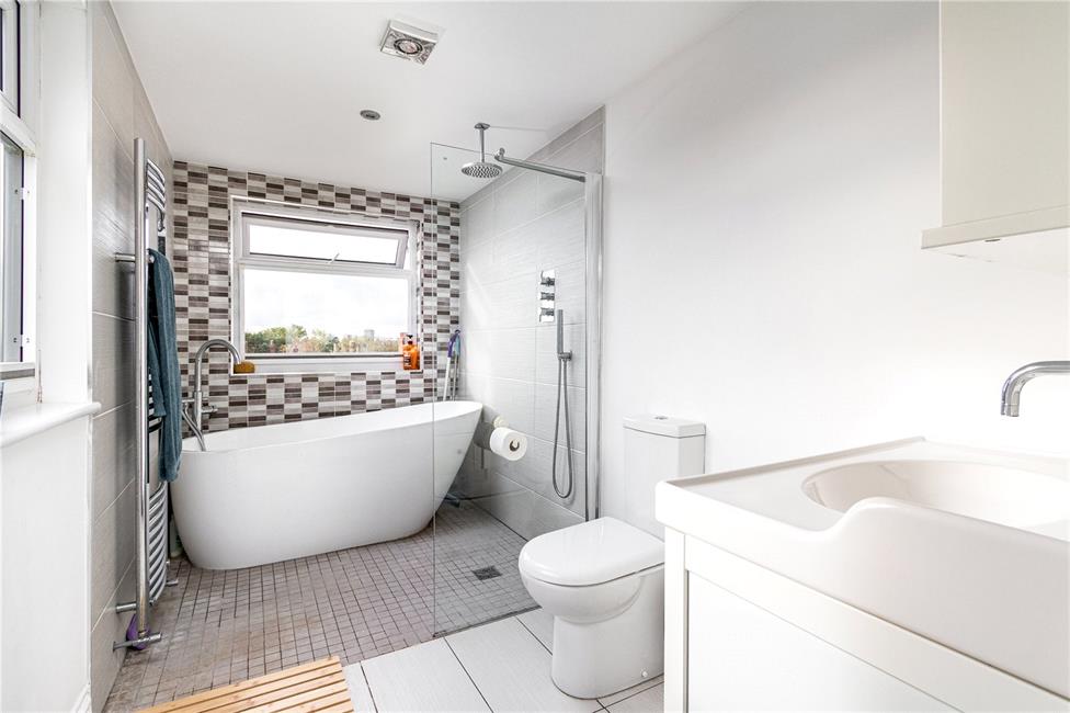 bath with glazed shower screen and shower, head quality ceramic floor and wall