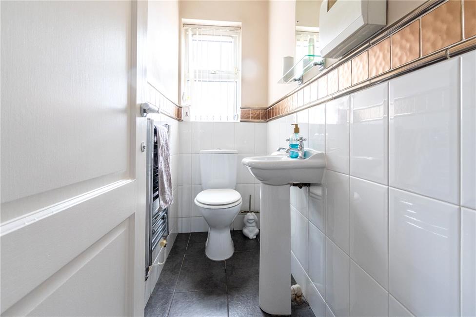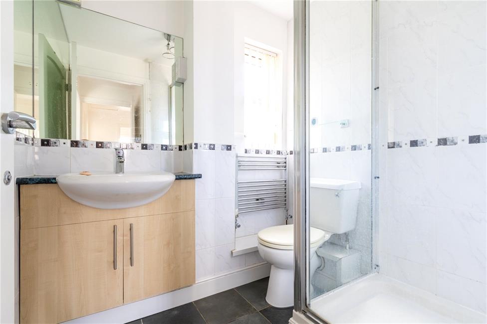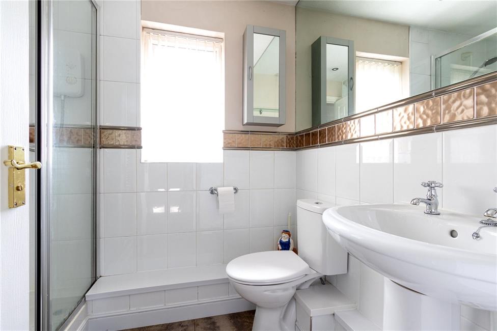 Pedestal wash hand basin, low level WC, double glazed shower with shower screen panels, chrome heated towel rail, attractive ceramic wall tiling with border, chrome heated towel rail.