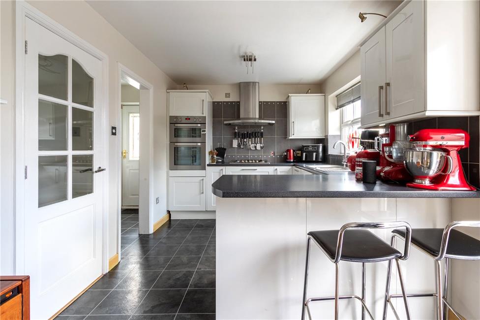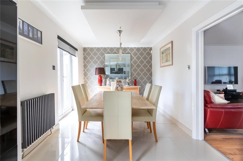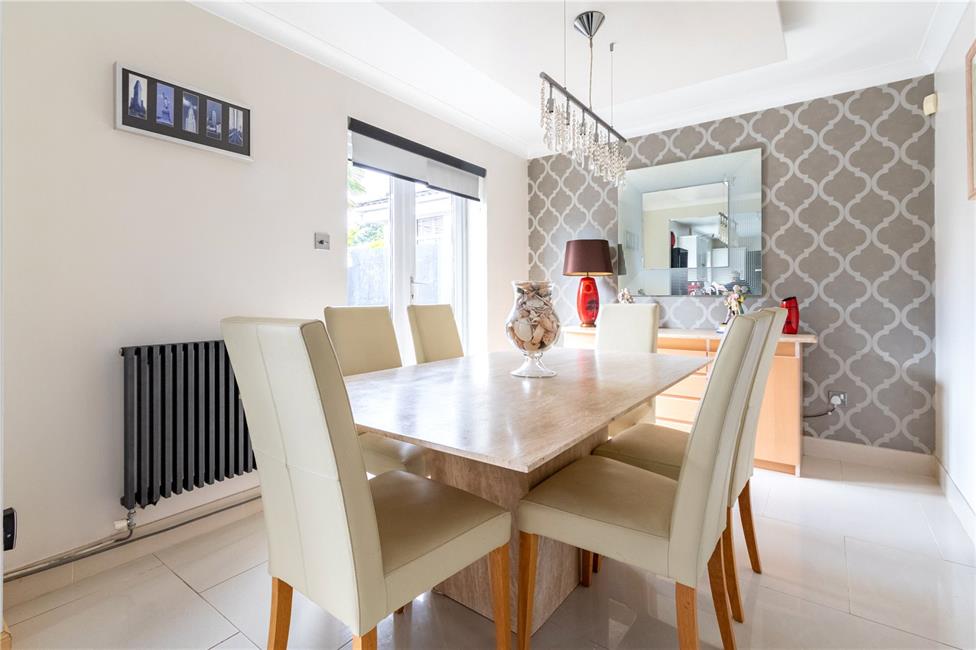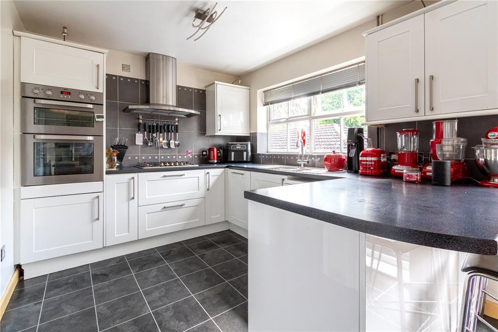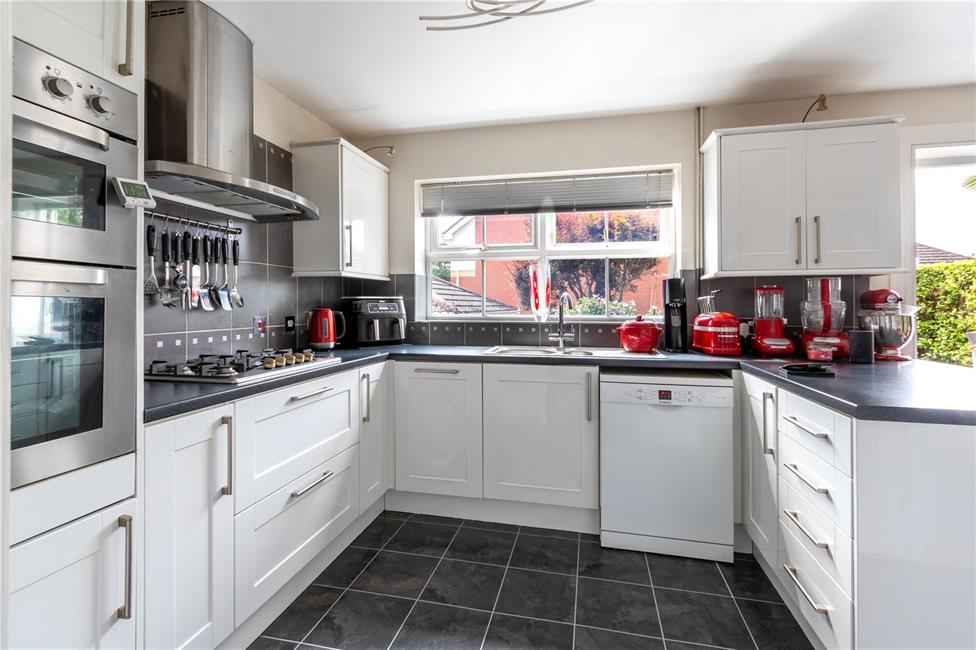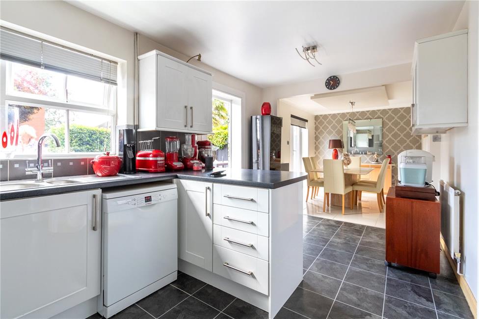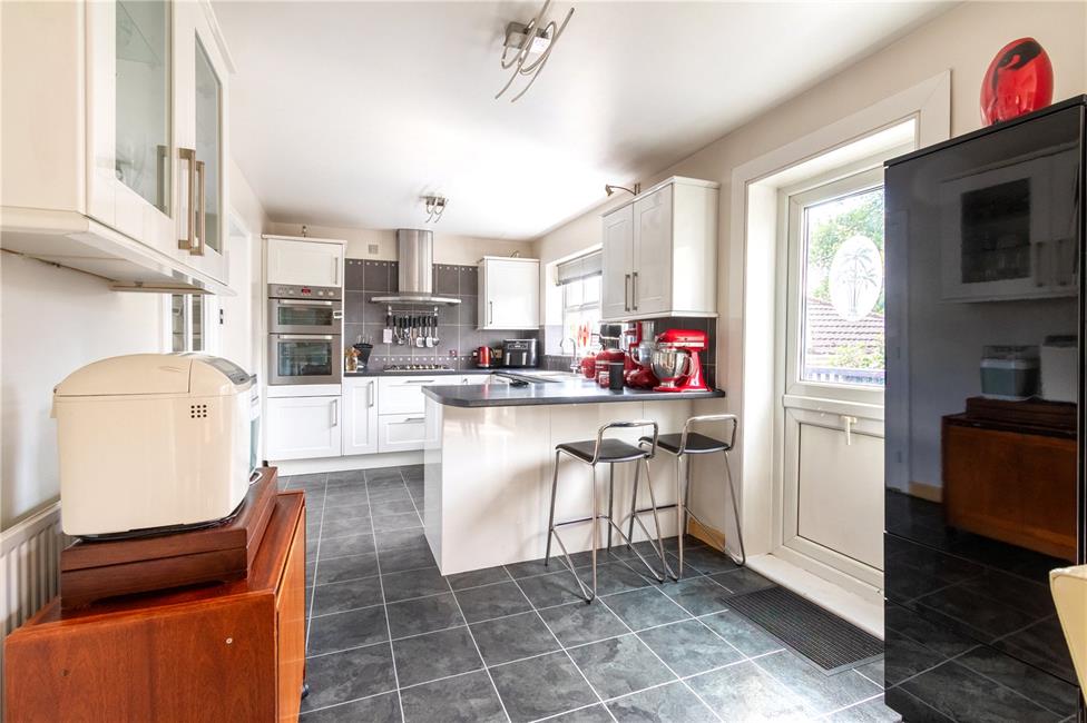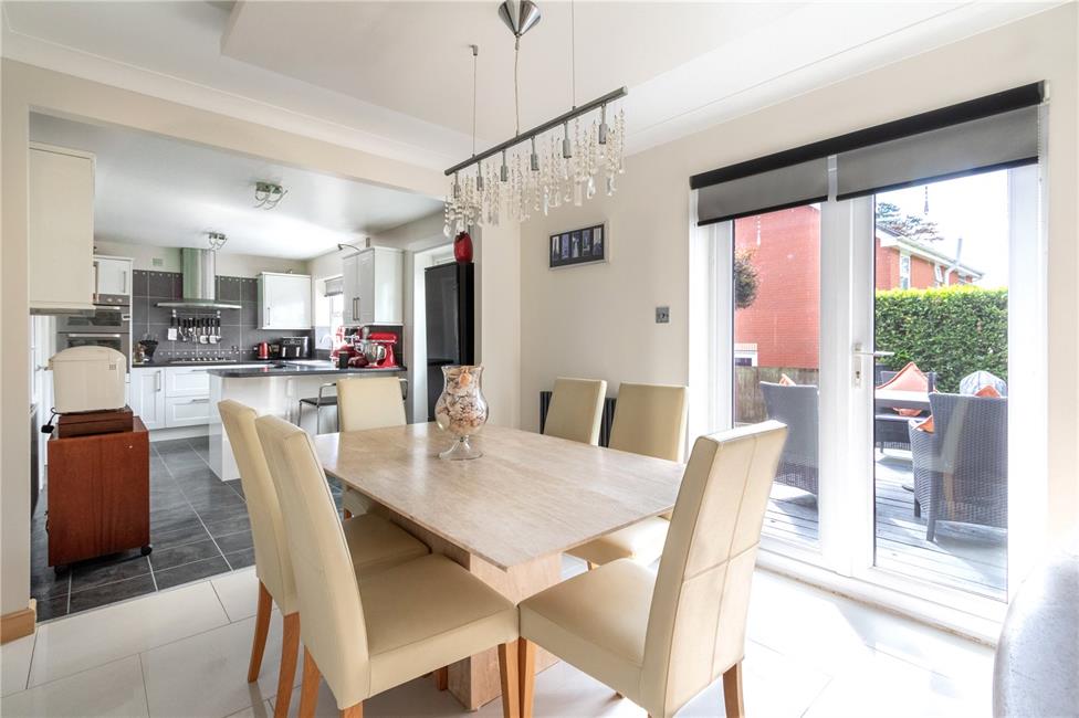 Appointed along two sides in white vinyl fronts beneath round nosed worktop surfaces, inset 1.5 bowl sink and drainer with mixer tap, matching range of base and eye level wall cupboards with pelmets and borders, inset five ring Kenwood hob with AEG circulating fan above, integrated AEG double oven with grill, plumbed for dishwasher, peninsular breakfasting bar, ceramic wall tiling to worktop areas, pleasing aspect to the rear garden, single stable style door leading to the rear patio, panelled radiator, opening to family/dining area with double glazed french doors leading onto the rear patio, porcelain tiled flooring, stylish wall radiator.