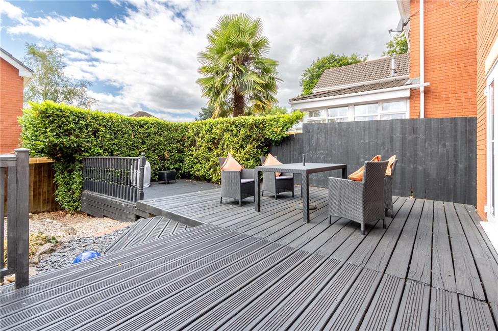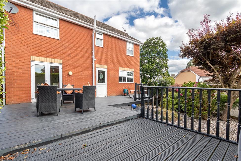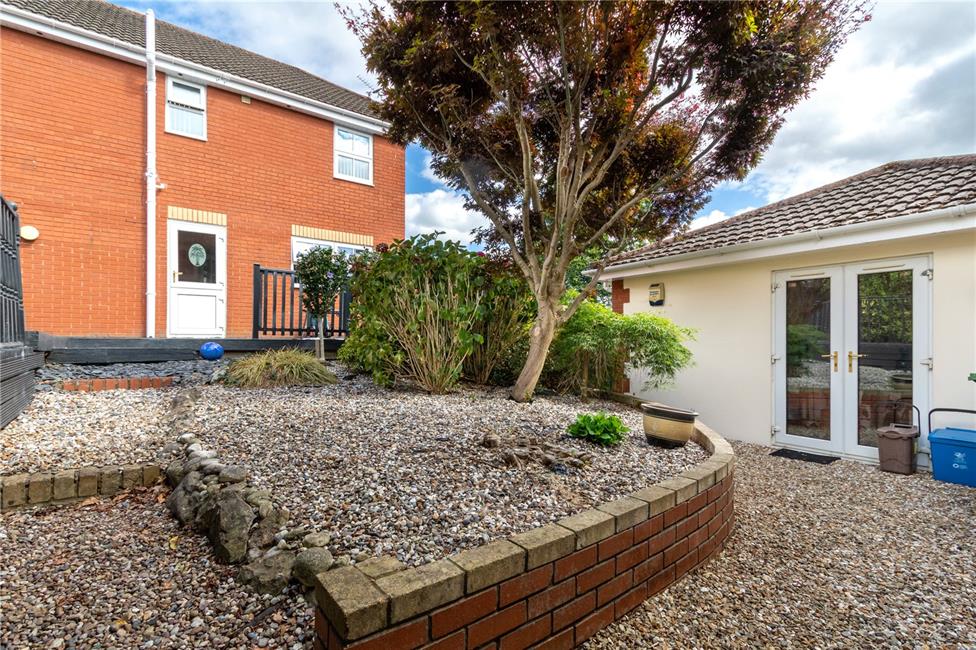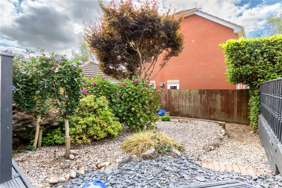 Ornamentally laid with areas of rockery, shrubs and plants with loose slate finishes, feature circular paved focal point. Keyblock path and steps leading to the entrance porch. Timber gate to side returning to the rear garden. Wide keyblock driveway with contrasting paviours leading to the twin garages. Additional gate to side leading to the rear garden.