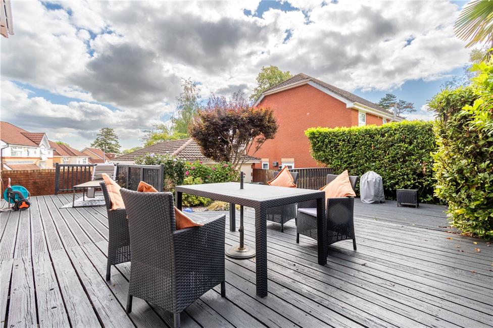 Wide timber deck patio relaxation area, ideal for eating al fresco, with balustrade enclosure, ornamentally laid, with flowering shrubs and plants, enjoying a sunny and private aspect. Outside water tap. Outside lighting.