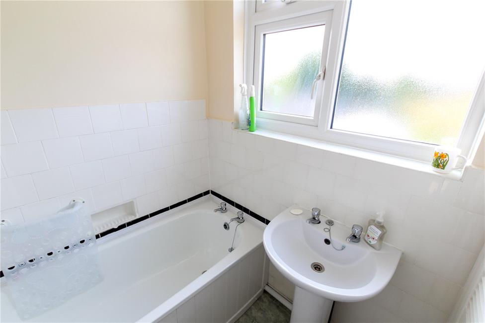 Panelled bath with Mira Jump shower, pedestal wash hand basin, louvre fronted airing cupboard with hot water tank, double glazed window to rear.