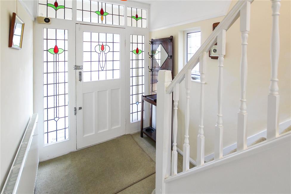 Decorative arched Bathstone surround, double glazed front door with matching side screens, leading onto entrance vestibule area.