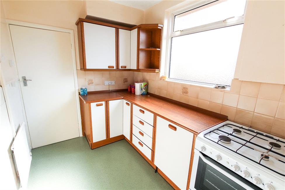 With a range of base and eye level wall cupboards beneath round nosed worktop surfaces, space for gas cooker, tiled splashbacks, double glazed obscure window to side, panelled radiator.