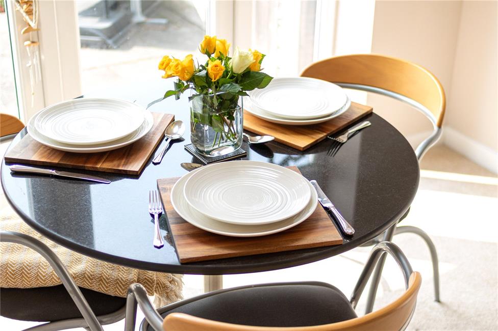 Kitchen appointed along two sides in modern white gloss finished fronts beneath lipped worktop surfaces, inset stainless steel one and a half bowl sink and drainer with mixer tap, four ring induction hob with stainless steel cooker hood, integrated oven and grill, integrated dishwasher, matching range of eye level units with concealed lighting, matching central island unit with storage cupboards and drawers, space for an American style fridge freezer, inset spotlights, quality tiled flooring, ample space for a family dining table and lounging area, radiator, three velux roof light, uPVC French doors with full height matching glazed side panels leading onto the rear patio.