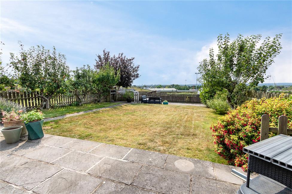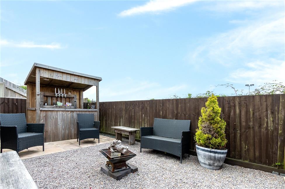 Generously sized, paved patio area leading down onto a large section of with paved pathway leading to a further patio relaxation area, enclosed with timber fencing, established boarders with a variety of shrubs and fruit bearing trees, further secluded area to the rear laid with loose stone chippings, timber garden shed, paved area with timber built garden bar.