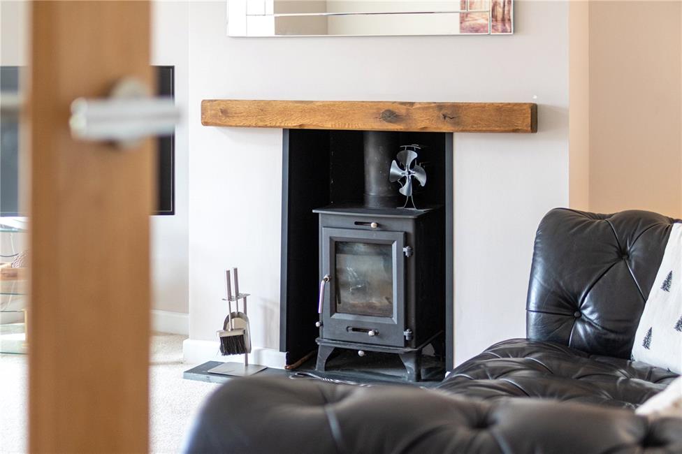Feature fireplace with timber mantel and wood burning stove, velux roof light, radiator, uPVC French doors with full height matching glazed side panels leading onto the rear garden.