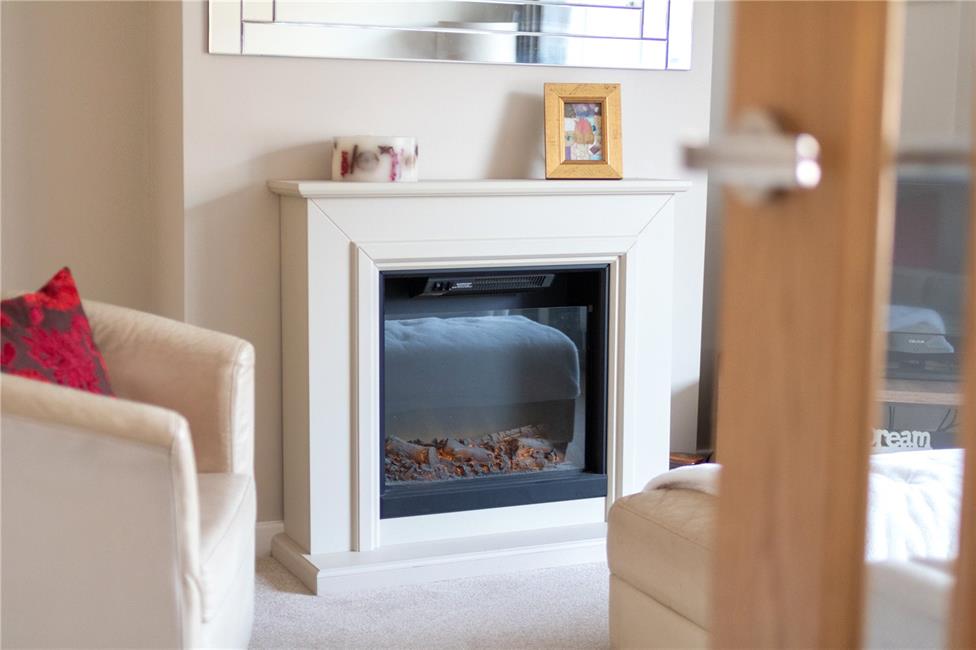 Large window overlooking the front driveway, modern feature fire surround with log effect electric fire, radiator.