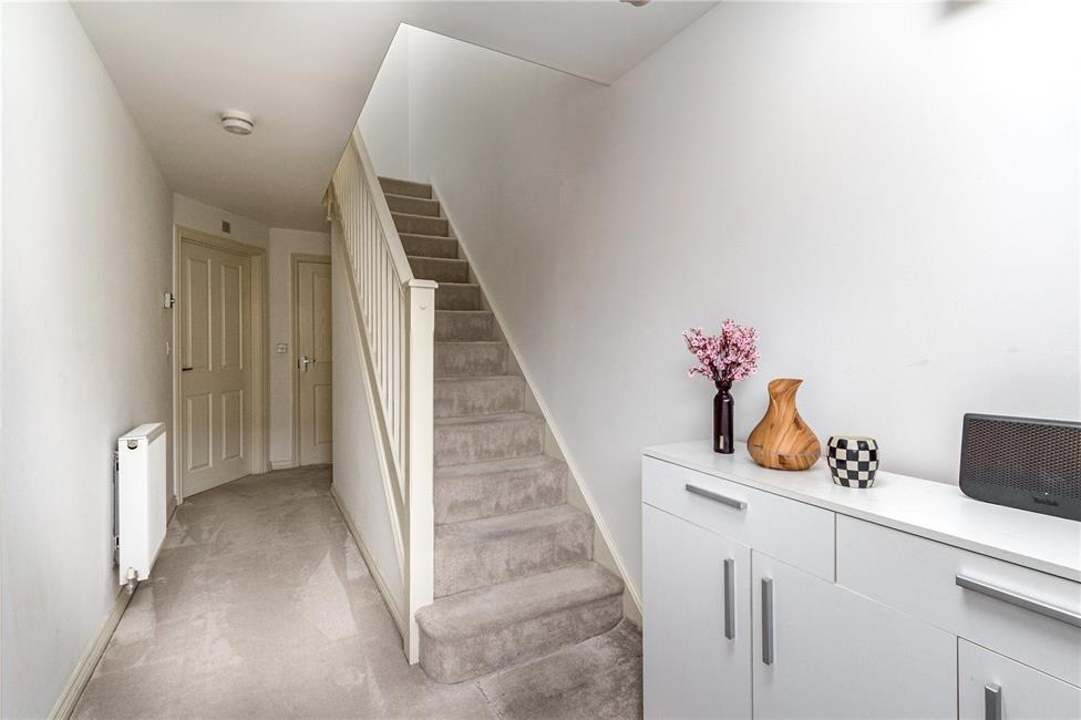 Approached by an entrance door with opaque glazed inserts to upper part, leading onto a central hallway with spindle staircase to the first floor landing, window to front, radiator, useful under stairs storage cupboard.