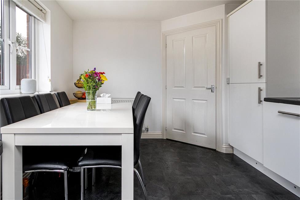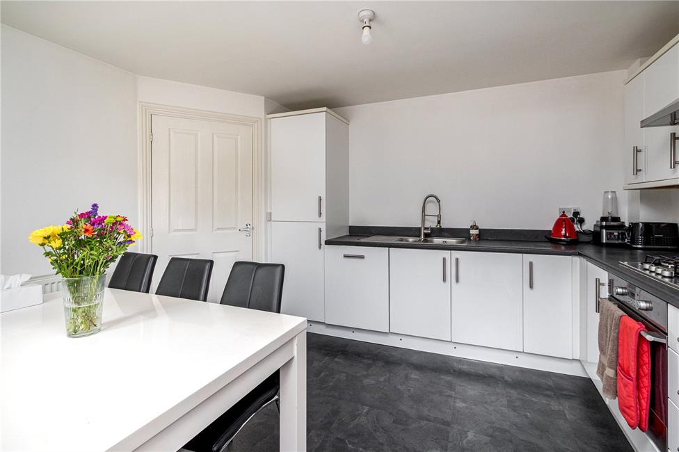 Appointed along two sides in modern white gloss finish fronts beneath round nosed worktop surfaces, inset 1.5 bowl stainless steel sink and drainer with mixer tap, four ring gas hob with oven below and stainless steel splashback and cooker hood, space for automatic washing machine, integrated fridge and freezer, integrated dishwasher, matching range of eye level units, ample space for dining table, radiator, quality vinyl floor tiling, window and glazed door onto the rear patio and garden.
