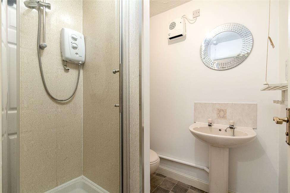 Comprising low level WC, pedestal wash hand basin, panelled bath with shower, glazed shower screen panel, ceramic wall tiling to wet areas, electric wall heater.