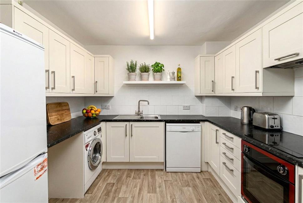 Appointed along three sides in light fronts beneath round nose worktop surfaces, inset stainless steel sink and drainer with mixer tap, range of base and eye level wall cupboards with pelmets and boarders, inset electric hob oven below and cooker hood above, wall tiling to worktop areas, plumbing for automatic washing machine, electric wall heater.