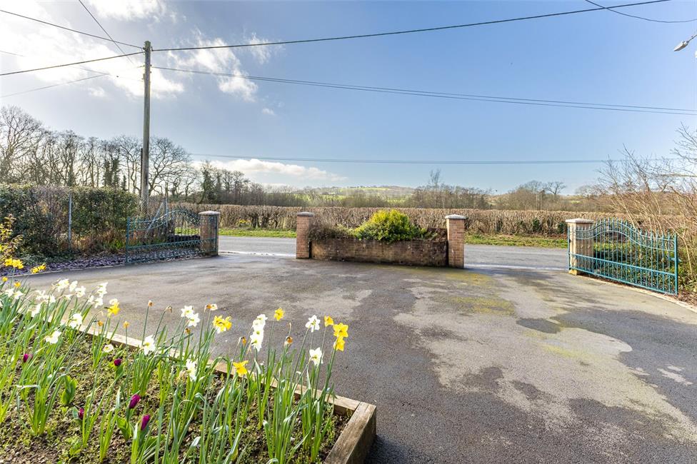 The in-and-out driveway leads to a large forecourt with parking for numerous vehicles and an attached garage.