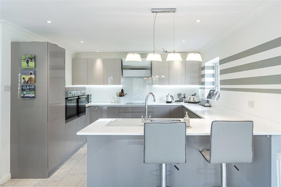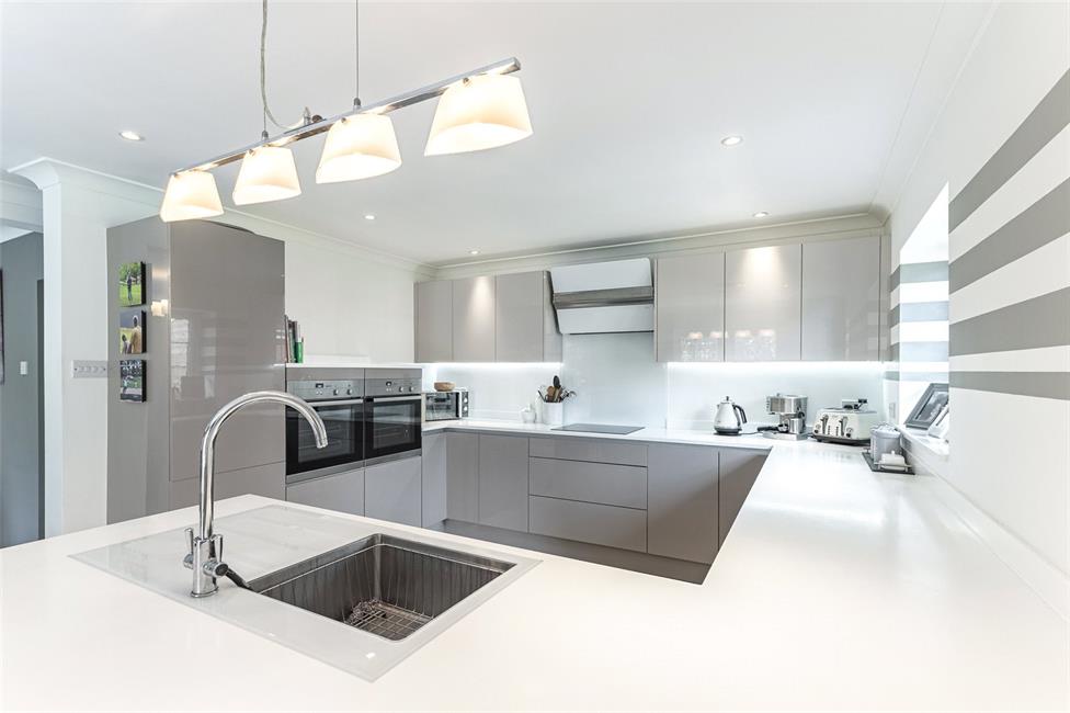 to side, stylish modern kitchen fitted along four sides, Amtico flooring, Elica