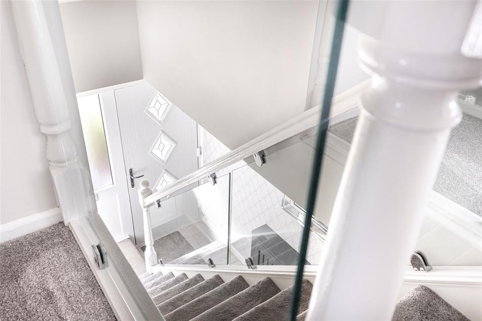 flight staircase to first floor with newel posts and glass panelling, additional double