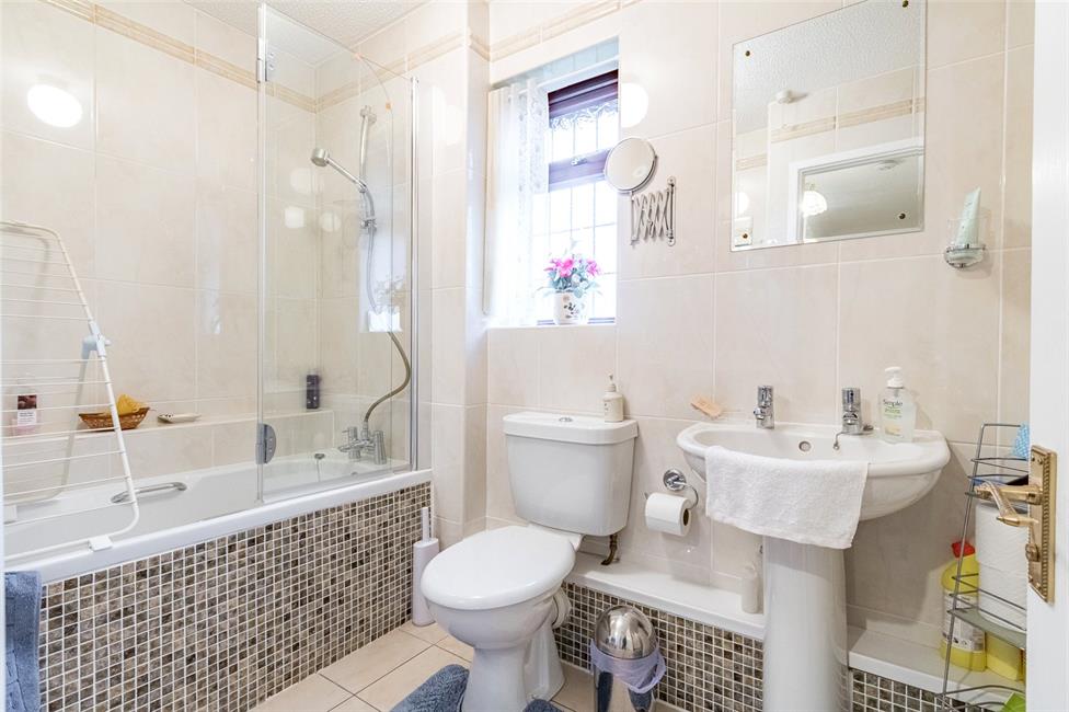 Modern suite comprising low level WC, pedestal wash hand basin, panelled bath with glazed shower screen panel, ceramic floor tiling with border, tiled flooring, panelled radiator.