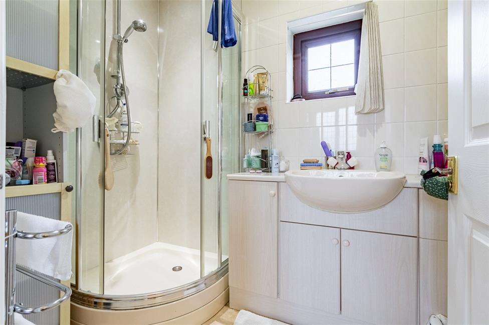 Large corner shower unit with shower head and glazed shower screen panels, low level WC, vanity wash basin with cabinets below, ceramic wall tiling, chrome heated towel rail.
