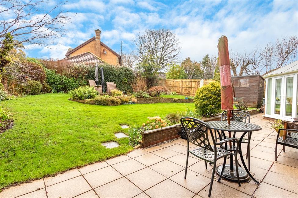 Wide paved patio relaxation area leading onto an area of lawn with raised brick flower beds, leading onto an additional patio area at far end, well stocked with shrubs and plants. Timber garden shed.
