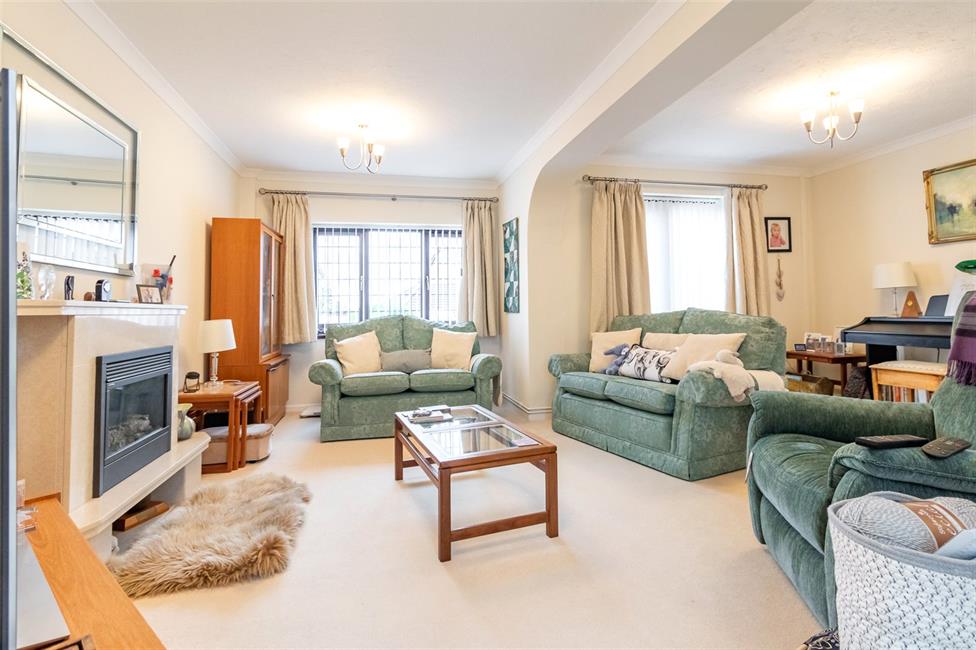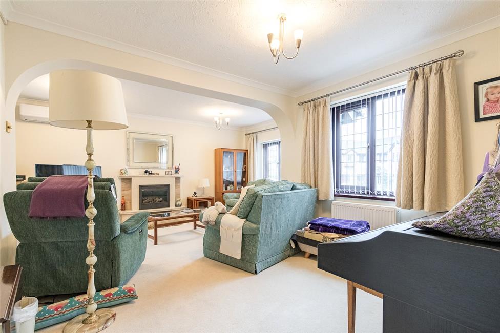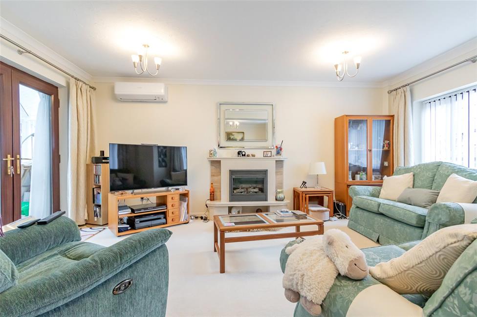 With two windows overlooking the entrance approach, feature conglomerate marble fire surround with hearth and display shelves, electric convection heater, Mitsubishi air conditioning and heater unit, two panelled radiators, double glazed French doors leading to the conservatory.
