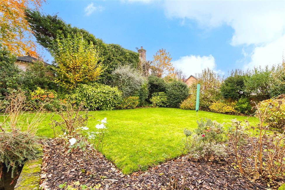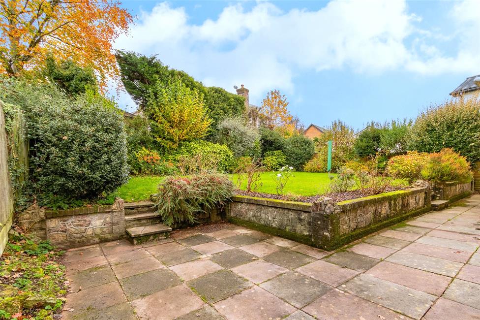 Paved patio area with raised brick and stone walling, leading onto an area of lawn with rose and shrub borders, bordered by shaped mature hedges and trees. Contiguous garden store adjacent to the utility room.