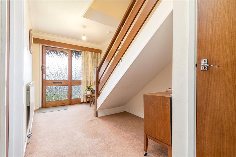 Approached by a fully glazed door with matching obscure side panels, leading onto a wide central hallway with staircase to first floor level, galleried landing, panelled radiator, storage area under stairs recess, built out cloaks cupboard with cloaks rail and shelving.