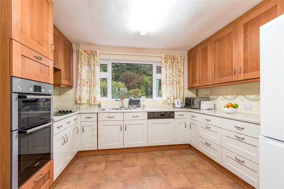Appointed along three sides beneath round nosed worktop surfaces, inset 1.5 bowl stainless steel sink and drainer with mixer tap, inset four ring electric hob with circulating fan above, matching range of eye level wall cupboards with pelmets and borders, ceramic wall tiling to worktop areas, integrated Bosch oven with separate grill, plumbed for dishwasher, double panelled radiator, pleasing aspect to the rear garden, door returning to hall.