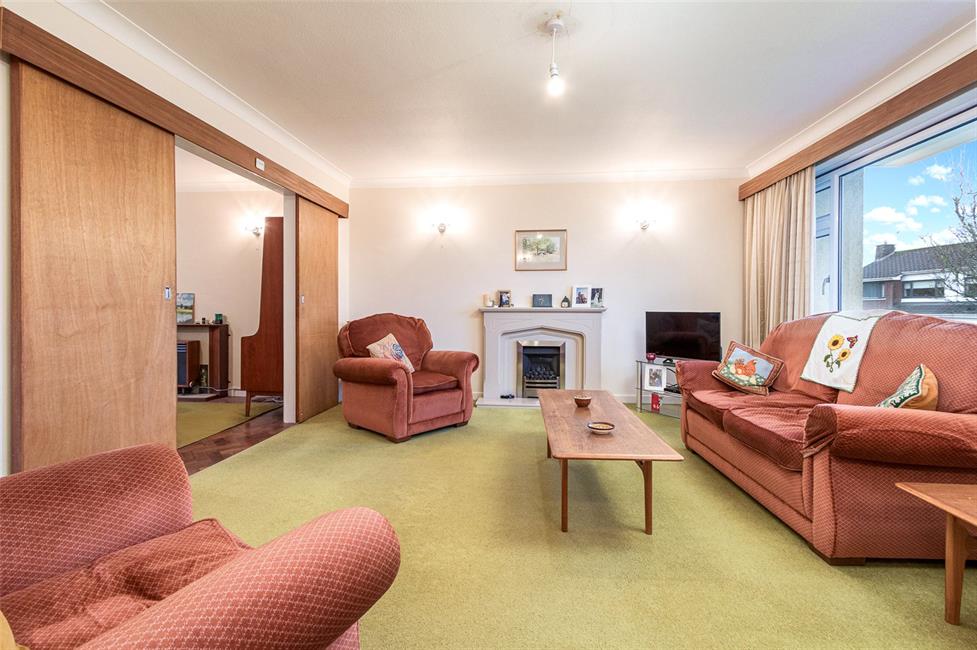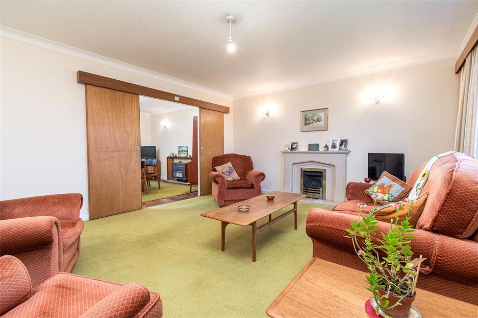 Overlooking the entrance approach with a large picture window enjoying a pleasant vista, contemporary style fire surround with matching hearth and mantel, living flame coal effect gas fire, panelled radiator, sliding double doors leading into dining room.