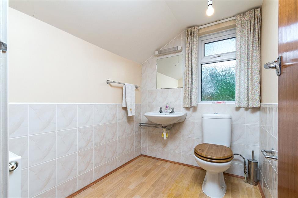 Low level WC, panelled bath, large shower cubicle with shower and glazed shower screen panels, shaped wash basin, twin radiators, ceramic wall tiling to wet areas, chrome heated towel rail, built out linen cupboard with shelf and tubular radiator.