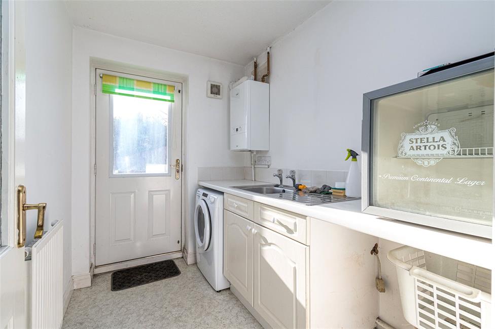 housing the hot water cylinder with shelving, full turning spindle staircase to first
