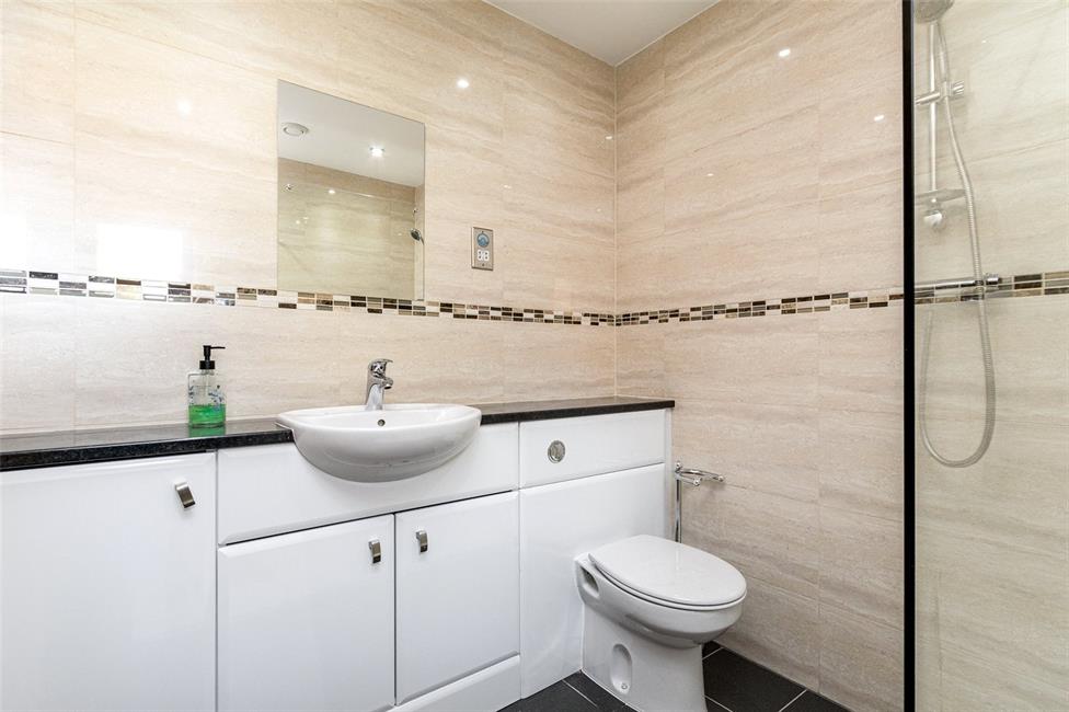 Stylish suite comprising of low level WC, vanity wash hand basin with display surface and cabinets below, panelled bath with hand grips, shower head with glazed shower screen panel, marble tiling with boarder, tiled flooring, chrome heated towel rail.