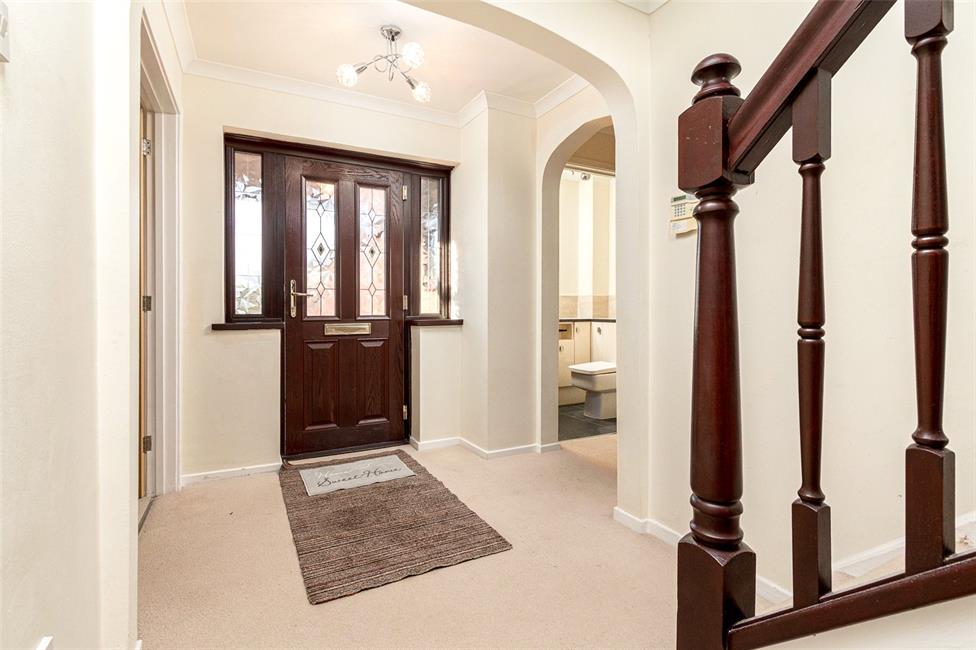 Cantilevered porch, large central hall, cloakroom, 18ft lounge, French doors, dining room, study, quality fitted kitchen/breakfast room with integrated appliances, laundry room, four bedrooms, stylish ensuite and family bathrooms. Gas central heating, UPVC double glazing, oak internal doors, fitted wardrobe to three bedrooms.