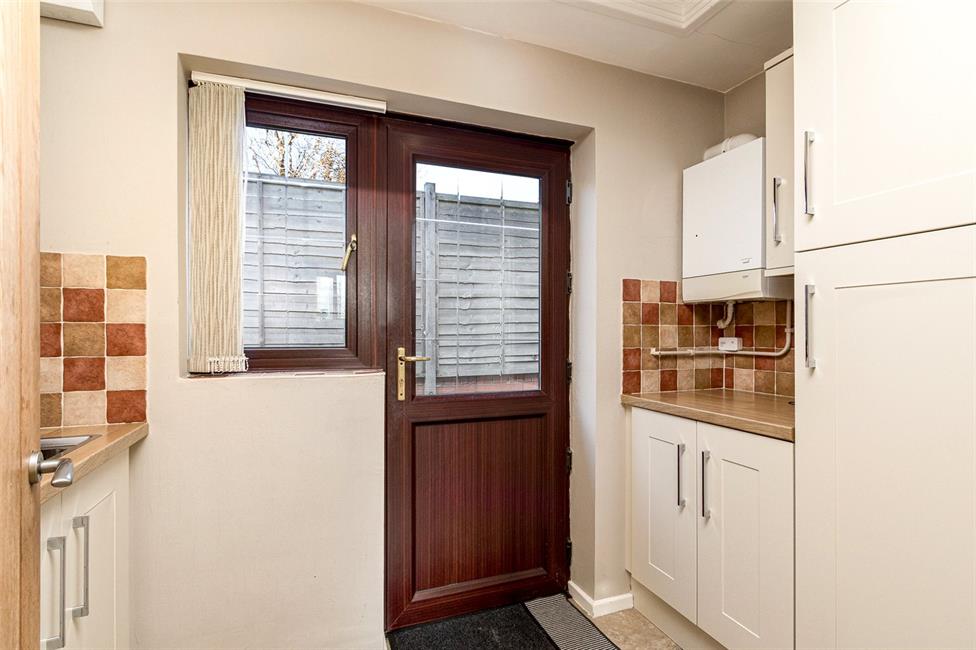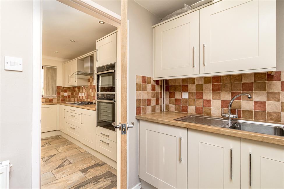Well-appointed along four sides beneath lipped work top surfaces, inset one and half bowl stainless steel sink with drainer with mixer tap, matching range of base and eye level wall cupboards with pelmets and boarders, pelmet lighting, inset five ring Neff gas hob with cooker hood above, integrated Neff oven with separate grill, integrated Neff dishwasher with matching front, aspect to front garden, integrated full height fridge with matching front, quality ceramic wall tiling to worktop areas, ceiling spotlighting, quality tiled flooring, radiator.