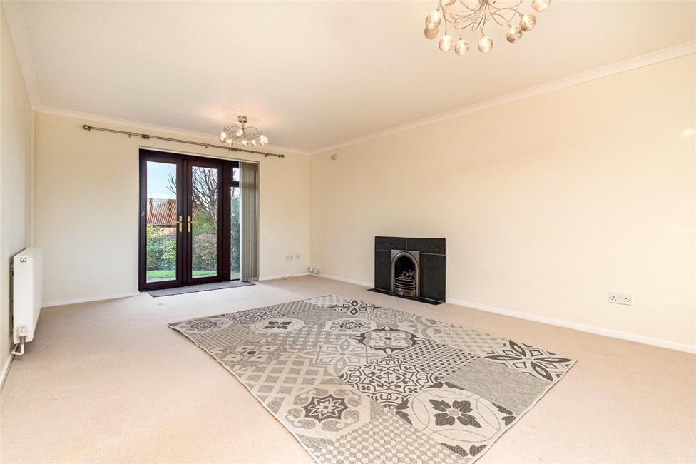 With dual aspects to the front and rear gardens, feature fire surround with coal effect gas fire, tiled hearth and surround, French doors into the rear patio and garden, two panelled radiator, oak twin doors returning to hall.