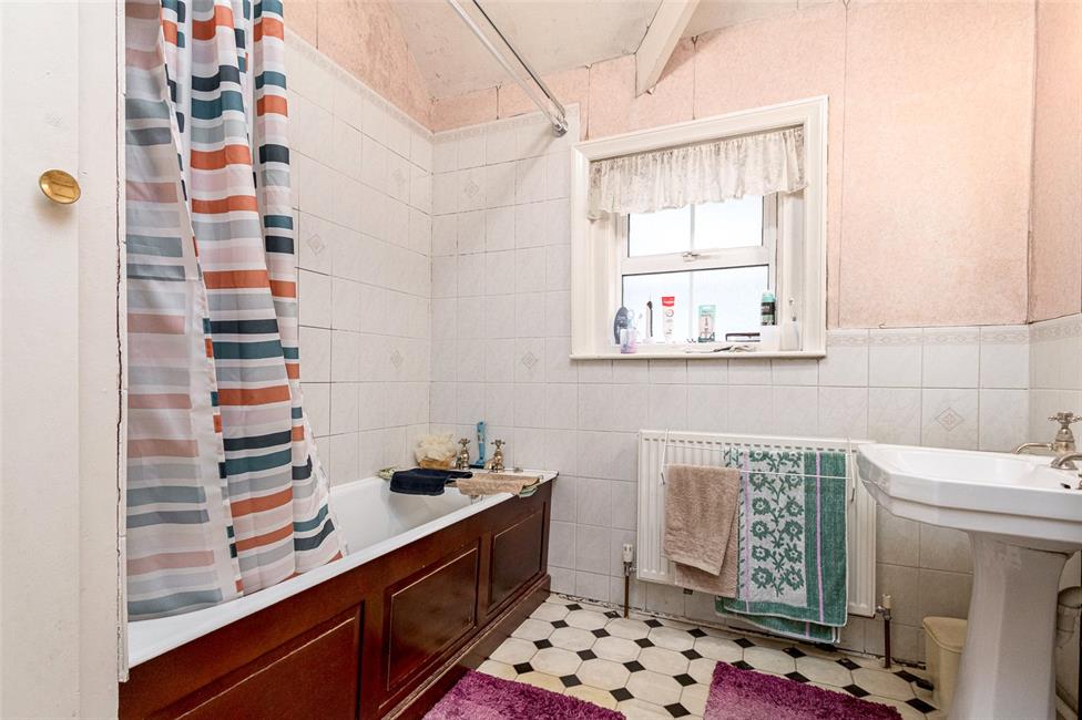 Comprising of a panelled bath with electric Triton shower, pedestal wash hand basin, radiator, ceramic wall tiling to wet areas, built-in linen cupboard with shelving, vinyl floor covering.