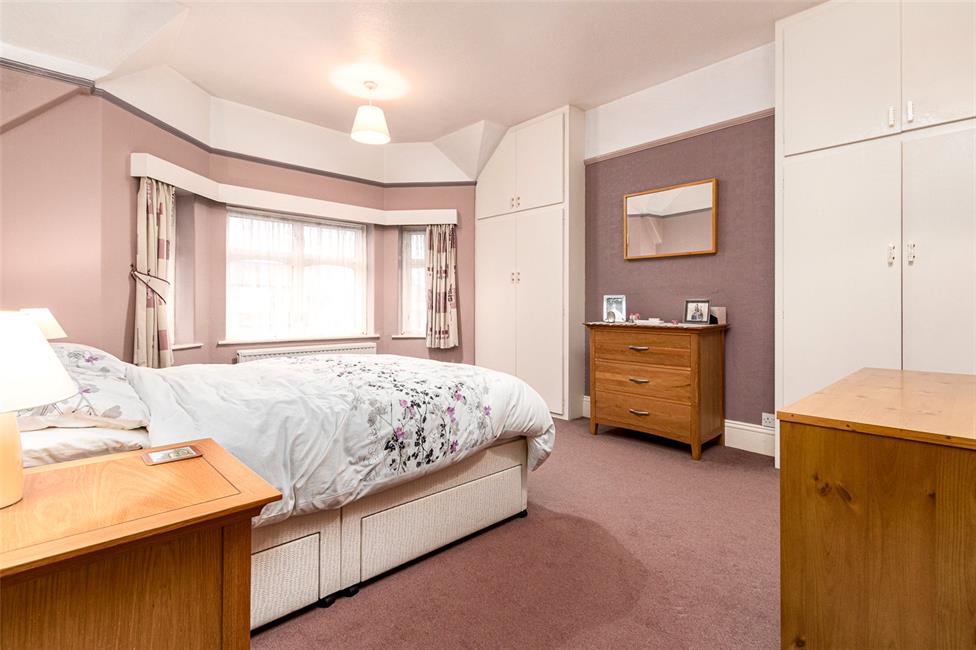 Bay window to front, a generous principal bedroom, fitted wardrobes to alcoves, picture rail, radiator.