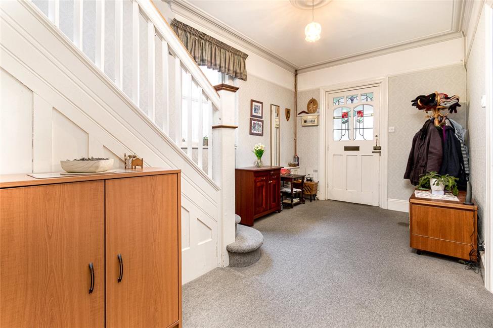 Approached by a timber framed entrance door with decorative colour leaded feature windows to upper part, leading onto a large and welcoming central hallway, corniced ceiling, picture rails, half turning spindle staircase to first floor landing, window to side, radiator.