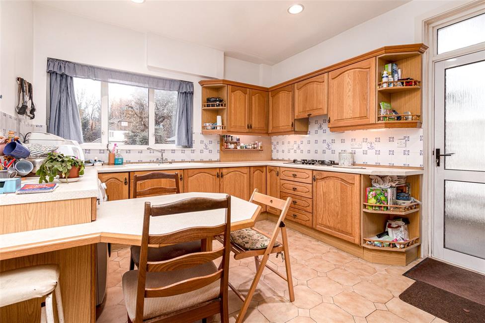 Appointed along three sides with Shaker style base units beneath round nosed worktop surfaces, inset 1.5 bowl sink and drainer with mixer tap, four ring gas hob with concealed cooker hood, integrated Bosch oven and microwave, space for freezer, integrated low level fridge, space and plumbing for automatic washing machine, peninsular breakfast bar, matching range of eye level units with pelmets and borders, wall mounted gas central heating boiler concealed behind a matching unit, inset spotlights, window overlooking the large rear garden, opaque glazed door to side, tiled flooring, radiator.