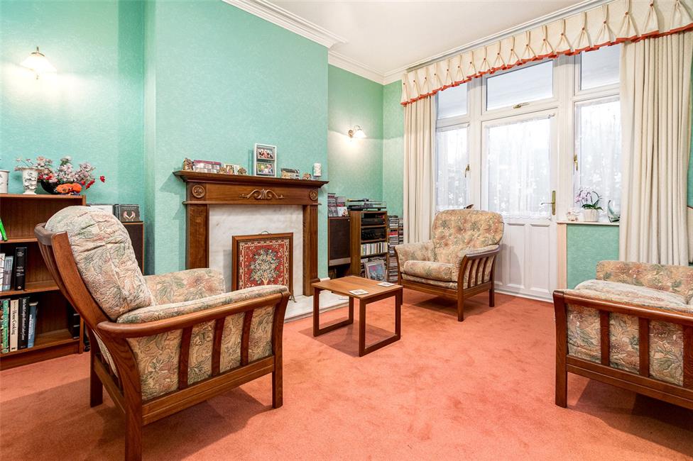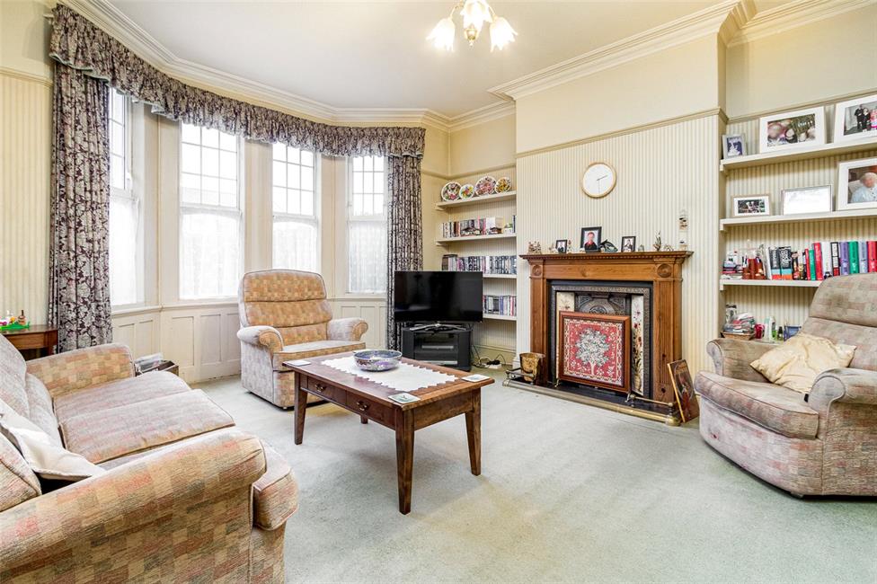 Bay window overlooking the enclosed front driveway, traditional style feature fireplace with decorative tiles on a slate hearth (fireplace not currently functional), corniced ceiling, picture rails, radiator.