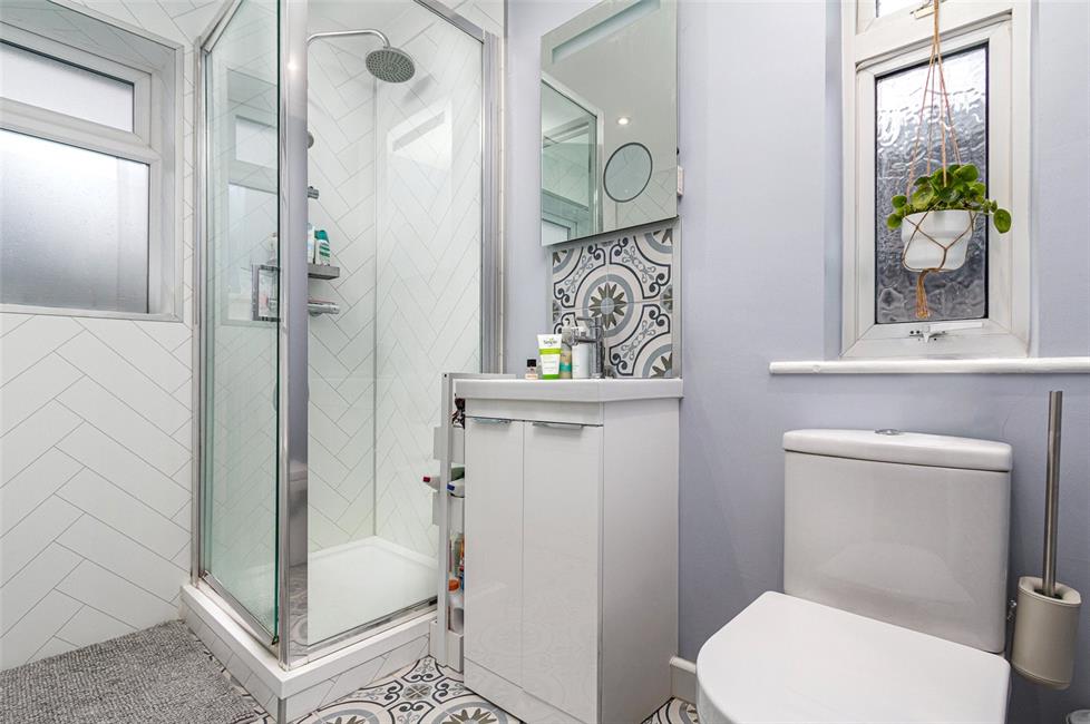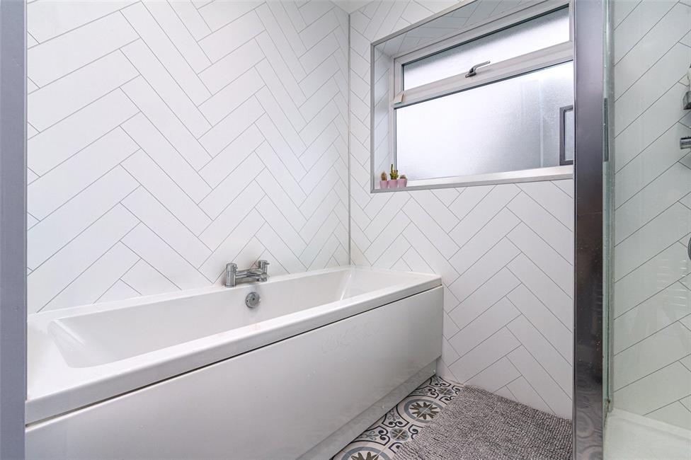 A completely refurbished and reconfigured bathroom with opaque windows to the rear and to the side, modern white suite comprising of a panelled bath with central taps and tile effect wall panelling, a separate large shower cubicle with fixed rainfall style shower head with thermostatic controls and flexible handle, wall mounted ceramic wash hand basin with storage below and wall tiles above, feature vanity mirror with built-in light, shaver point and shaving magnifier, close coupled push button WC, ceramic floor tiling, heated chrome towel rail, ceiling spotlights.