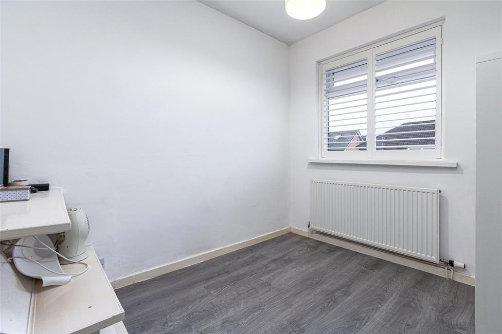 Aspect to the front with window shutters, radiator, wood effect grey strip flooring, over stairs plinth.