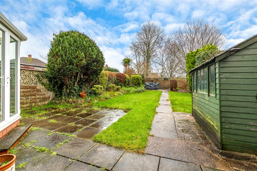 A generous rear garden with an initial paved patio area, timber shed (we believe has asbestos type roof covering), a central path leads to the rear boundary flanked with generous lawned areas and further established plants, trees and shrubbery to the borders, a further patio to the rear of the garden backing onto Court Road Park. Outside water tap, external lighting.