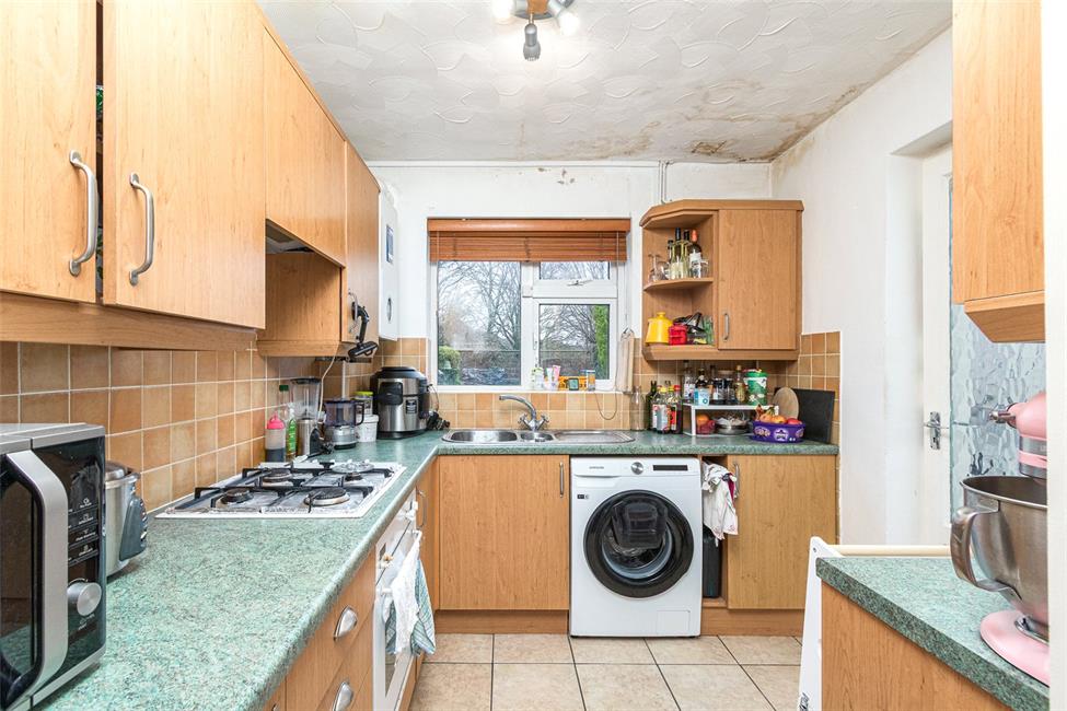 Overlooking the generous rear garden and open space beyond the boundary, kitchen is appointed along three sides comprising eye level units and base units with drawers and round nosed worktops over, ceramic wall tiling to work surface surrounds, inset 1.5 bowl sink with mixer tap and drainer, fitted four burner gas hob with cooker hood above and electric oven below, plumbing and space for washing machine, ceramic floor tiling, wall mounted Worcester gas central heating boiler, glazed door into the laundry/store room.